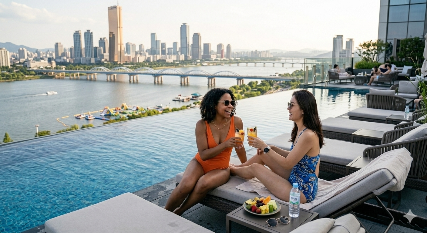 Chatting with your host friend by the pool against the backdrop of a sunset skyline and ordering delicious room service—this is the most comfortable and stylish way to spend a K-Summer vacation.