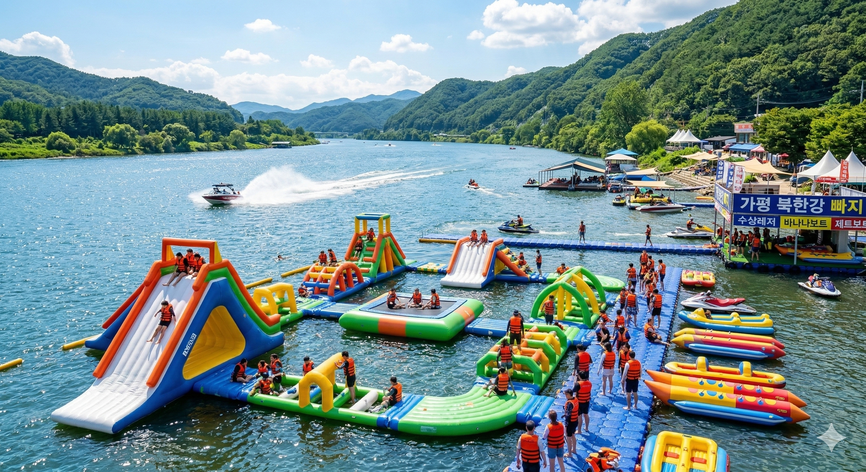 The hottest K-Water Play in August is at the 'Ppaji(River Barge Parks)' located along the river in Gapyeong or Gangchon! A 'Ppaji' is essentially a floating water theme park on the river, equipped with massive inflatable slides, trampolines, and various towable water sleds (like banana boats or peanut boats).